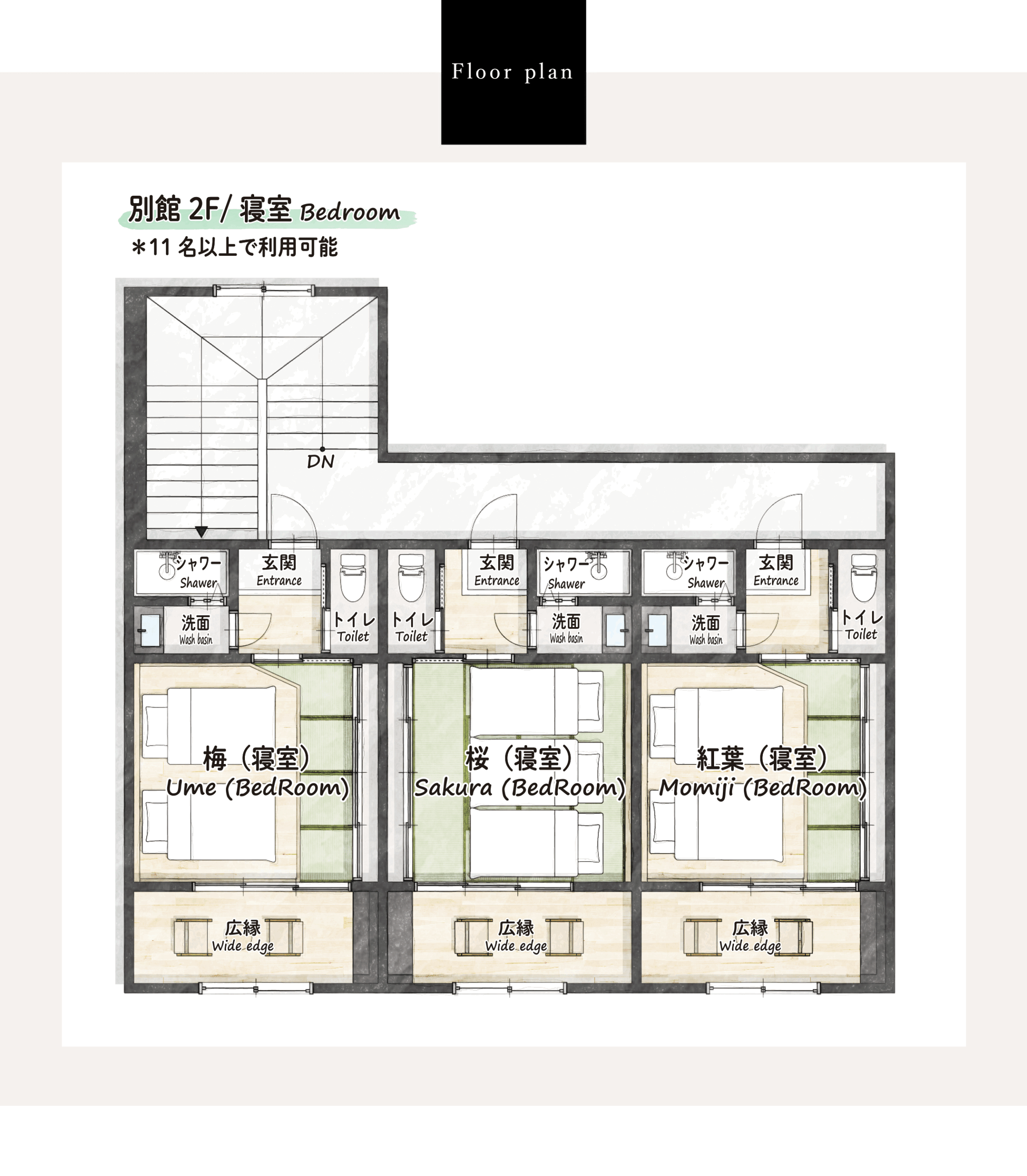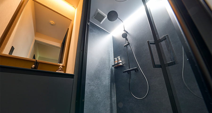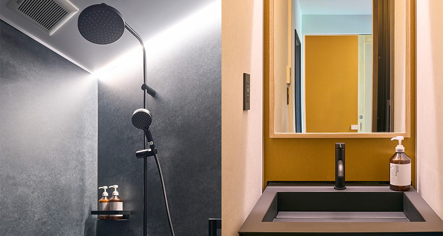 The room includes a private bathroom area with direct access—complete with shower, vanity, and an enclosed toilet. An extra futon can also be arranged, allowing up to three guests to stay comfortably.
